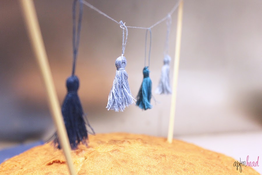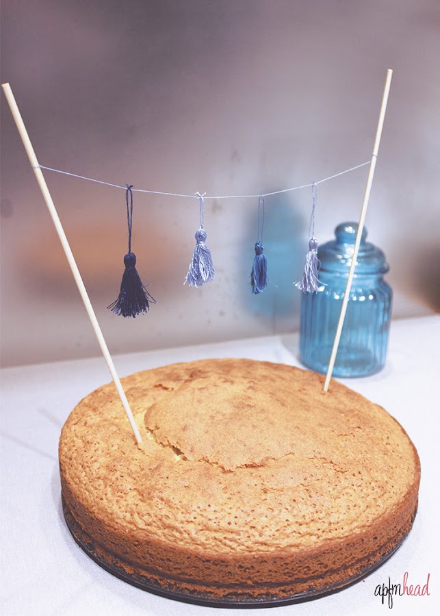 Para colocarlas y formar la guirnalda cogí dos palitos de madera de hacer pinchos y até un hilo uniéndolos. Luego fui pasando cada borla y separándolas entre ellas. Finalmente sólo queda pinchar los palitos en el bizcocho!
