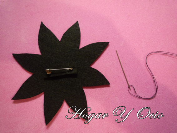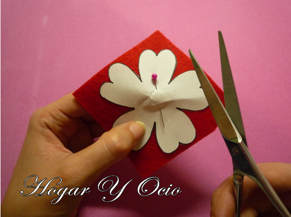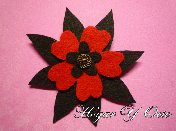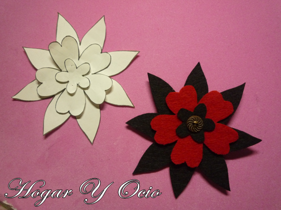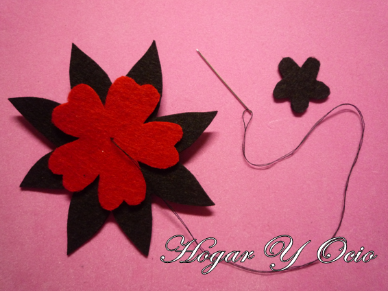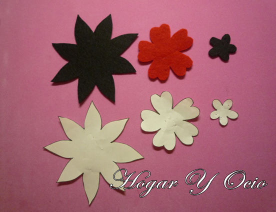 3. Trasladamos cada patrón de papel al fieltro ayudándonos de un alfiler y tijeras. La flor grande y la pequeña en fieltro negro, la flor mediana en fieltro rojo. Por supuesto, podéis cambiar los colores a vuestro gusto.