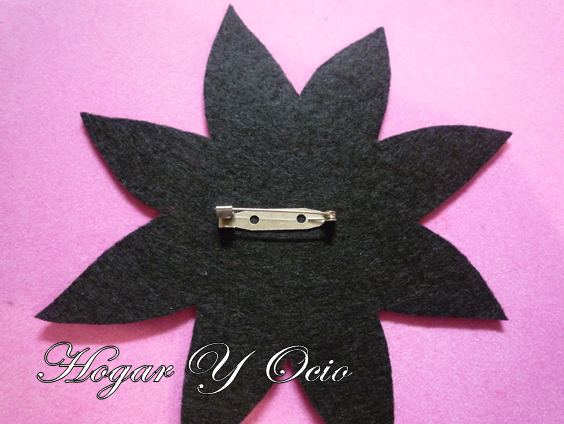 4. Ahora vamos a coser el cierre a la flor grande en la cara que será la parte trasera del broche. Otra opción es pegarlo con un poco de termocola. Lo que yo hago es forrarlo con un pedacito de fieltro y luego coserlo para que quede con mejor aspecto, podéis ver el proceso en las fotos.