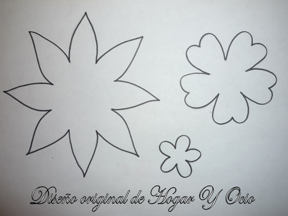 ELABORACIÓN:1. Comenzamos haciendo el diseño de los patrones en un folio. He dibujado tres flores que irán superpuestas.