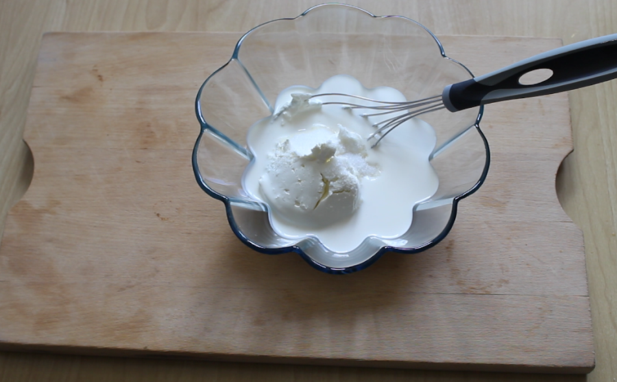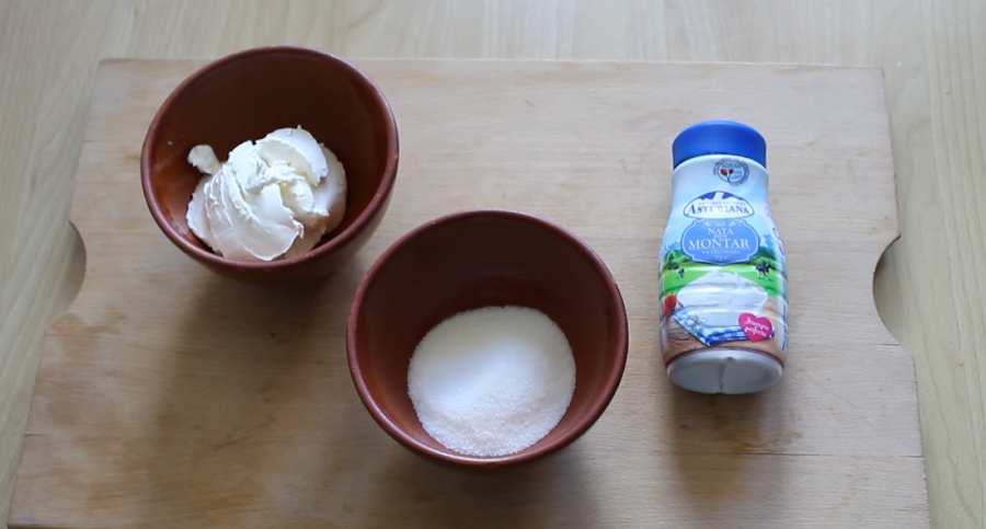 4.Paso: Verter 200 gr de Queso Mascarpone en un bol, añadir 200 ml de nata (crema de leche) y 65 gr de azúcar y batir con una batidora eléctrica y reservar.