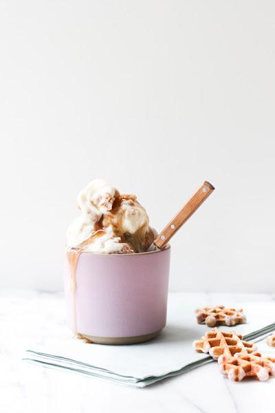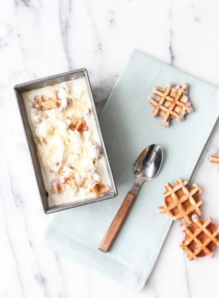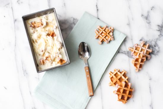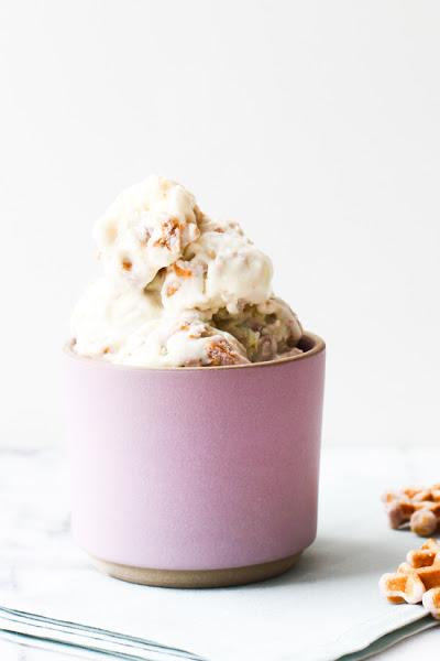 7.- Una vez la mezcla esté entre 7 y 8 grados centígrados ponla en la máquina de hacer helados. Este proceso tardará entre 35-45 minutos. Es importante que cuándo veas que ha cogido la textura de helado, añadas los trozos de gofre y una vez estén totalmente mezclados ya está listo!