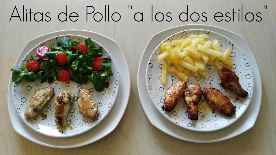 Y ya éstá, ya tenemos preparadas nuestras "alitas a los dos estilos", sólo nos queda presentarlas. En esta ocasión, las alitas "estilo Fé" las hemos acompañado con una sencilla ensalada de canónigos, tomates cherry y pasas, y para los peques hemos acompañado las alitas "estilo barbacoa" con unas patatas fritas. No nos falta de nada ;)