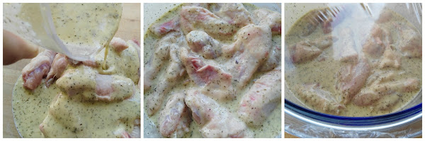 Para las alitas "estilo Fé", ponemos en el vaso de la batidora los ajos, el zumo de limón, el orégano, el tomillo o las hierbas provenzales, el aceite y el vino blanco y lo trituramos todo junto. El resultado es una salsa blanquecina que, en una fuente o un bol, echamos sobre las alitas. Tapamos con un film transparente y lo dejamos reposar unas dos horas en la nevera para que cojan sabor.