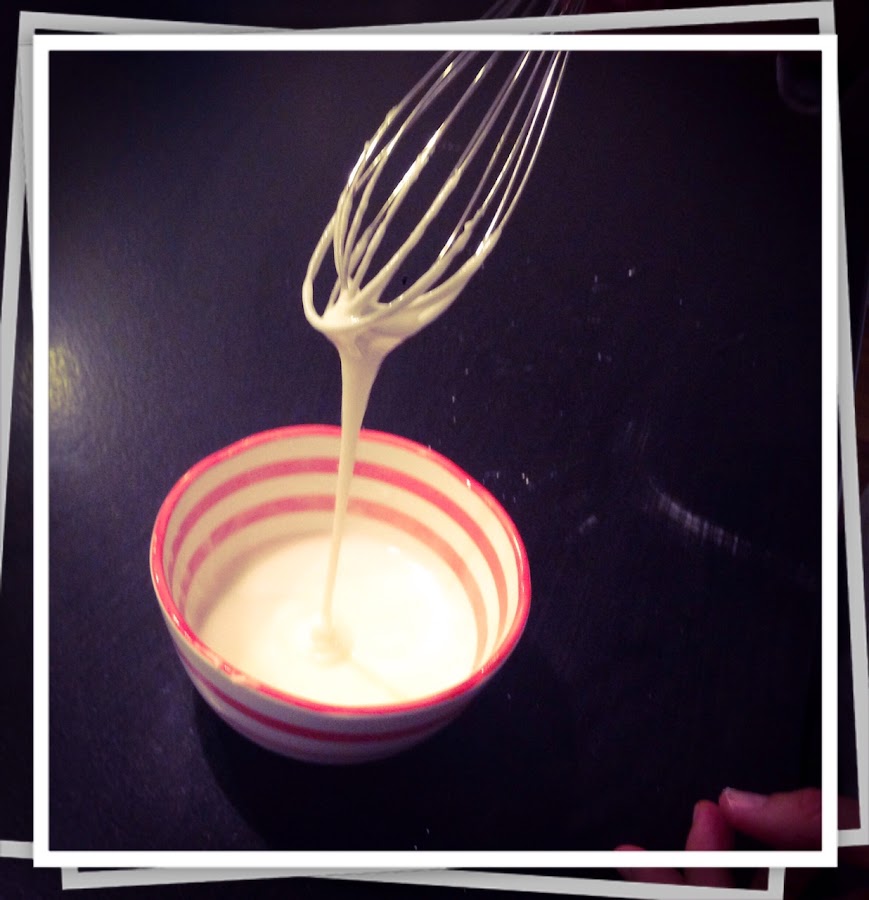 Se echan las tres cucharadas del líquido elegido - agua en este caso - sobre el azúcar glas y se mezcla muy bien con la varilla. Es un paso importante porque el azúcar no tiene que quedar ni muy líquido - se nos escurriría por los lados de la galleta-, ni tampoco tan espeso que sea difícil de extender.