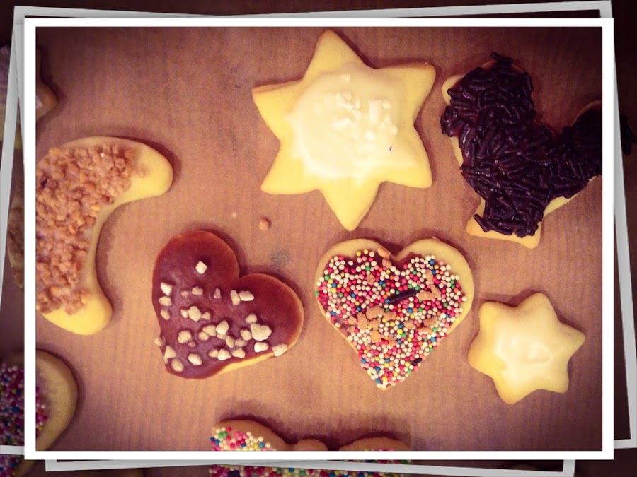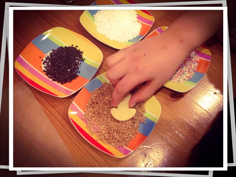 Cuando ya lo tenemos listo, vamos cogiendo las galletas una a una, y untándolas por una de sus caras - la parte "de arriba" mejor - en el azúcar. A continuación, y por la misma cara, las untamos en nuestra decoración para que se pegue bien. Después las dejamos en el papel de horno hasta que estén bien secas y la decoración no se caiga al moverlas.