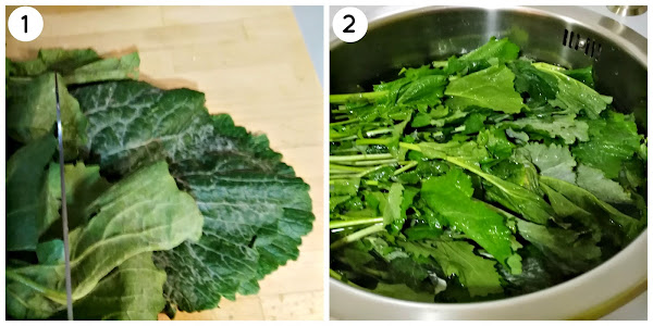 Comenzamos recortando las puntas de las hojas y los tronchos (1). Después, lavamos las hojas. Aunque un manojo parezca poco, los respigos en crudo son voluminosos, ocupan mucho y además suelen tener restos de tierra, por eso es aconsejable lavarlos directamente en el fregadero (2).
