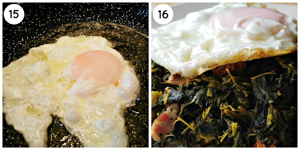 Ya sólo nos queda freír un huevo para cada ración (15) y colocarlo en el plato encima de los respigos (16). Si además conseguís que el huevo os salga con puntilla al estilo de mi abuela Tina, ya... mejor que mejor ;))