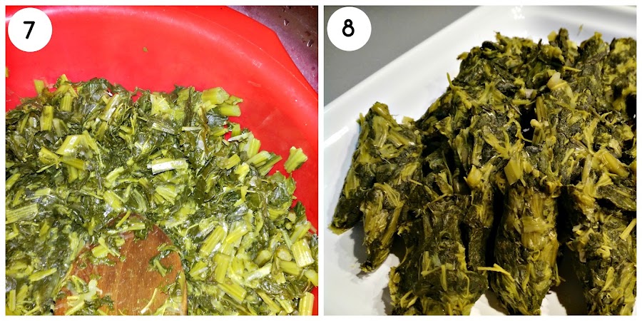 Pasados esos 25 minutos, retiramos la cazuela del fuego, y echamos los respigos en un escurridor (5) y los aplastamos un poco con una cuchara de palo, para retirar el exceso de agua. En este punto, si consultáis por ahí más recetas veréis que hay discrepancias sobre cuántas veces han de cocerse los respigos. Hay quien opina que con una vez es suficiente, pero ante la duda, yo he consultado con mi Sra. Madre - ¿con quién si no? ;) - y ella me dijo que mejor cocerlos dos veces para que pierdan su amargor, así que eso hice. Después de escurridos, se vuelven a colocar en la cazuela, se vuelven a cubrir con agua y repetimos la operación anterior, es decir, los volvemos a poner al fuego y, desde que rompan a hervir, otros 25 minutos.