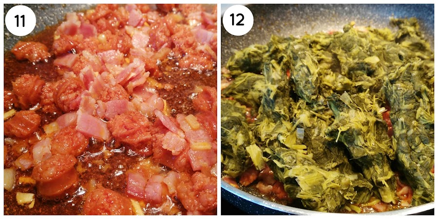 Cuando los ajos ya estén doraditos, añadimos el chorizo - o chistorra - y el beicon o la panceta (11) - ya veis el colorcillo que está cogiendo la cosa ;) -. Lo dejamos hasta que el embutido esté bien frito y, entonces, añadimos los respigos en esa misma sartén y lo rehogamos todo bien durante un buen rato para que se vayan mezclando bien los sabores (12).