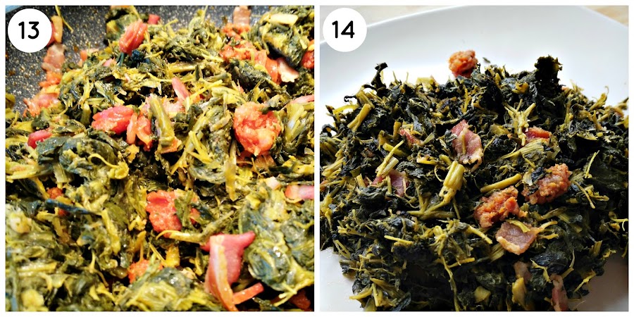 Veréis que poco a poco los ingredientes se van mezclando hasta que tienen un aspecto parecido al de la foto (13). En ese momento, retiramos los respigos del fuego, los servimos en los platos (14) y le añadimos un poco de sal, ya sabéis, eso, al gusto de cada uno ;)