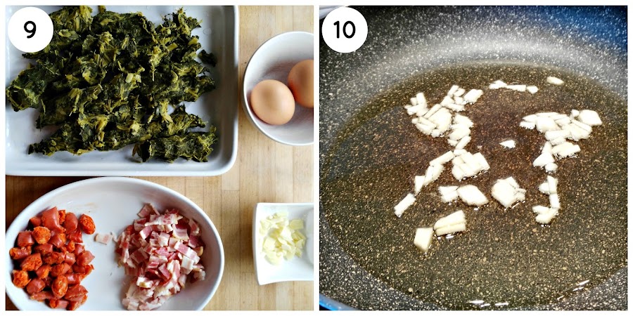 Ahora que ya tenemos los respigos cocidos y sin agua, es el momento de pasar a la segunda parte de la receta. En primer lugar troceamos también el chorizo - yo, la chistorra -, el beicon o la panceta - depende de si lo preferís ahumado o no -, y el ajo (9). A continuación ponemos la sartén al fuego con un buen chorro de aceite de oliva y ponemos los ajos a dorar (10).