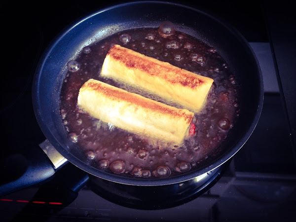 Cuando los tenemos listos, mojamos los rollitos en el huevo batido con leche y azúcar. Les quitamos el exceso de líquido y, a continuación, los ponemos a freír en la sartén que teníamos calentándose a fuego lento. Con cuidado de que no se nos salgan las fresas - ya veis en la foto que alguna lo intenta ;) - los vamos dando vuelta hasta que estén bien fritos. Entonces, los sacamos y los colocamos sobre un papel absorbente para quitar el exceso de aceite.