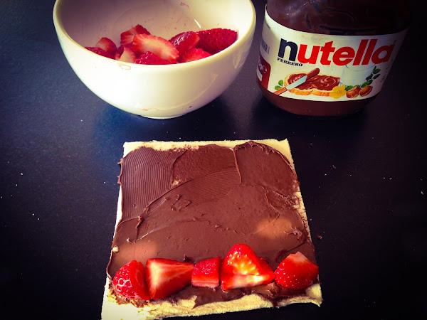 Una vez estiradas las rebanadas, las untamos con la crema de cacao, extendiéndola bien por toda la rebanada, y añadimos los trozos de fresa en uno de los costados, haciendo una fila. A continuación, lo enrollamos con cuidado para que las fresas no se nos salgan.