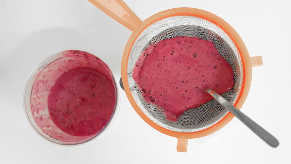 Como los arándonos y la frambuesas tienen muchas pipas y la cáscara no se deshace del todo, yo he pasado el batido por un colador para quitar todos esos restos. Este paso no es imprescindible, pero para un polo os recomiendo que no haya muchos grumos, pues es mejor una textura más homogénea.