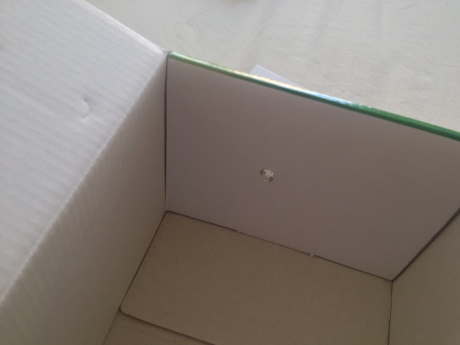 Ahora lo que hacemos es un orificio con el cutter de manera que podamos introducir por ahí el palito. Esto lo vamos a hacer en ambos extremos de nuestra caja. La distancia para hacerlo la medí tomando como referencia el carrete más grande de cinta que tenía, marqué un punto por el centro y listo.