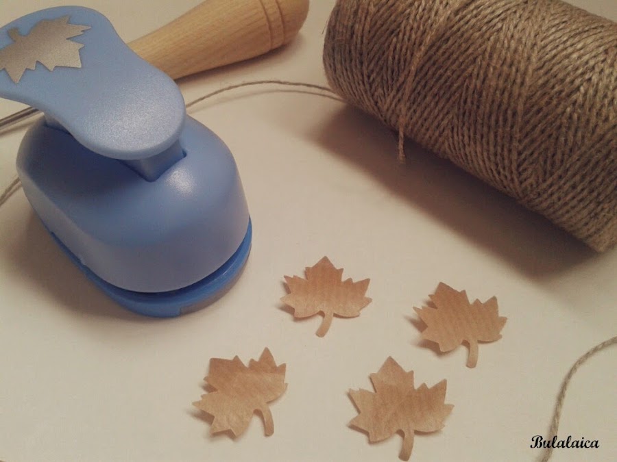Empecé haciendo unas hojitas en papel kraft con la ayuda de la troqueladora y con el punzón las hice un agujerito para pasar la cuerda por ellas.