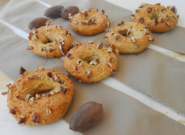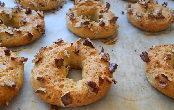 Cocinar en abundante agua hirviendo, escurrir y colocar sobre la bandeja para horno. Pintar cada rosquilla con la yema batida y espolvorear con las nueces troceadas.