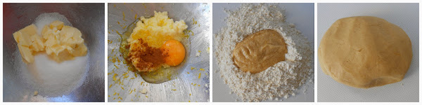 En un bol batir la mantequilla con el azúcar hasta obtener una crema. Añadir el huevo, la canela y la ralladura de limón. Poner la harina, tamizada con la levadura, en la encimera (mesada), formar un hueco en el centro de la harina y colocar la mezcla de azúcar, matequilla y huevo. Incorporar poco a poco los ingredientes uniendo bien hasta obtener una masa suave y lisa.