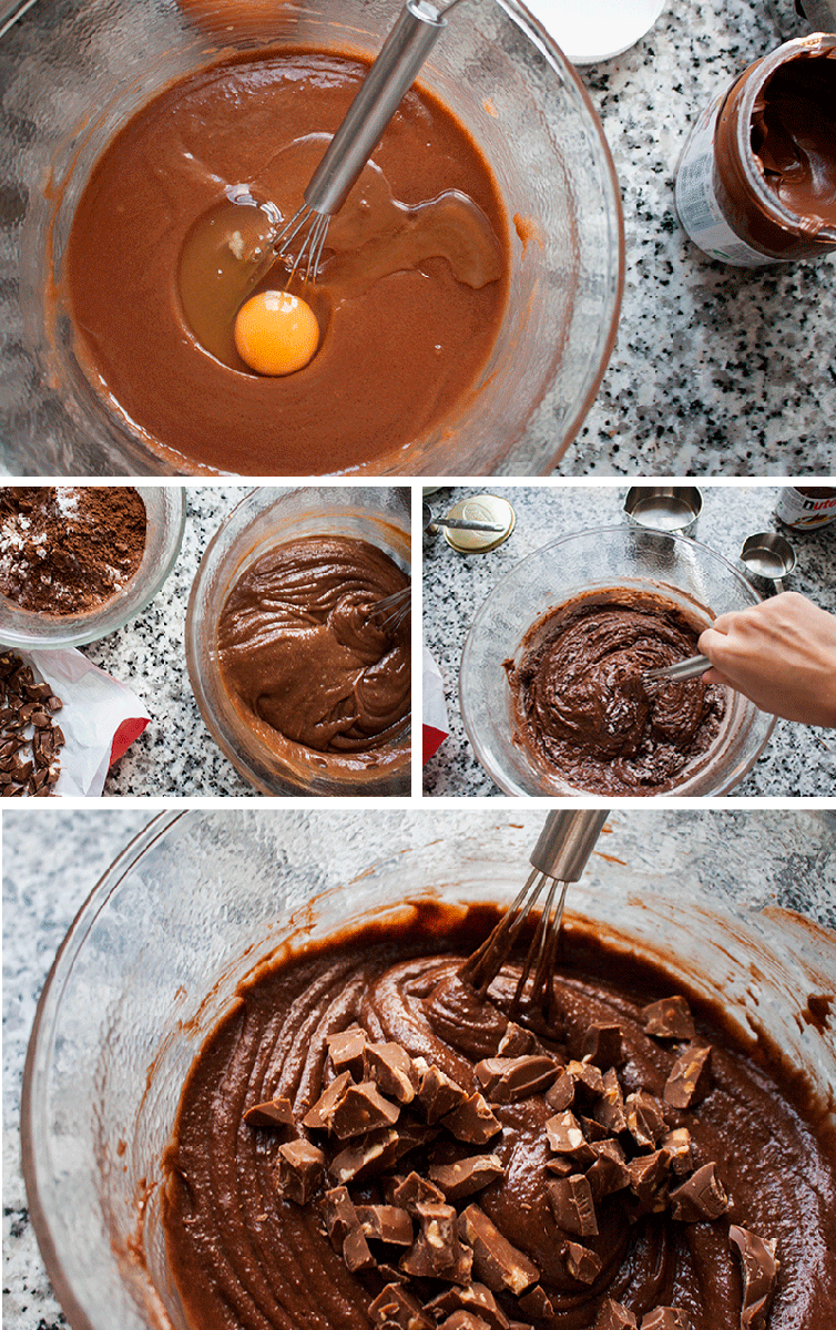 En un bol a parte mezclamos la harina, el cacao, la levadura y una pizca de sal. Vamos añadiendo esta mezcla poco a poco a la mezcla de la nutella. Removemos bien para que quede todo bien integrado.