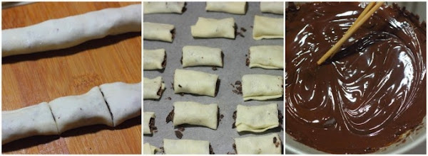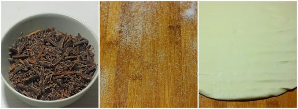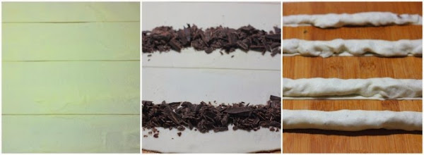 Cortamos en tiras de unos 10 cm de ancho y repartimos la mitad del chocolate colocando un "cordón" a lo largo de cada tira de masa tal como se ve en la imagen central.