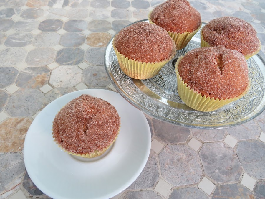 Algunas cosillas las he modificado, como alguna que otra proporción y la temperatura del horno. En total me salieron 12 muffins, aunque en la receta original decía que salen 10, supongo que dependerá del tamaño de las cápsulas de papel, pues yo utilicé las estándar para magdalenas, más bajitas que las de muffins. Así que sin más, os dejo las instrucciones de cómo lo hice y al final, os dejo las medidas para el glaseado por si os animáis a hacerlo así en lugar de cubrir con azúcar y canela.