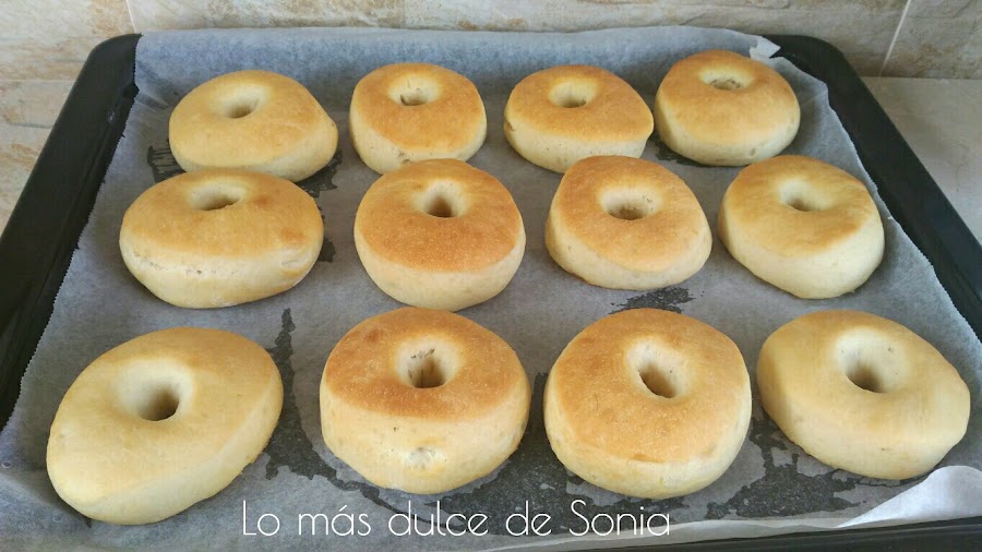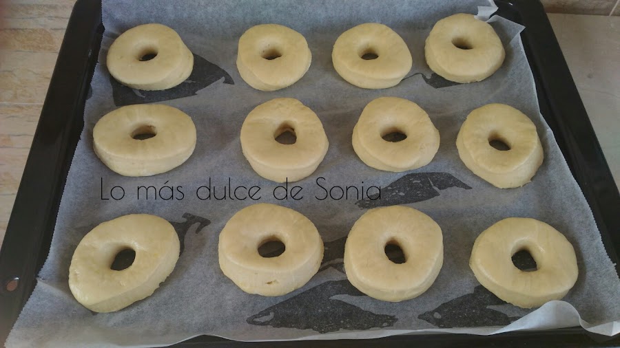 Colocamos los donuts en la bandeja de horno dejando cierta separación y dejar levar a temperatura ambiente aproximadamente 45-60 minutos.