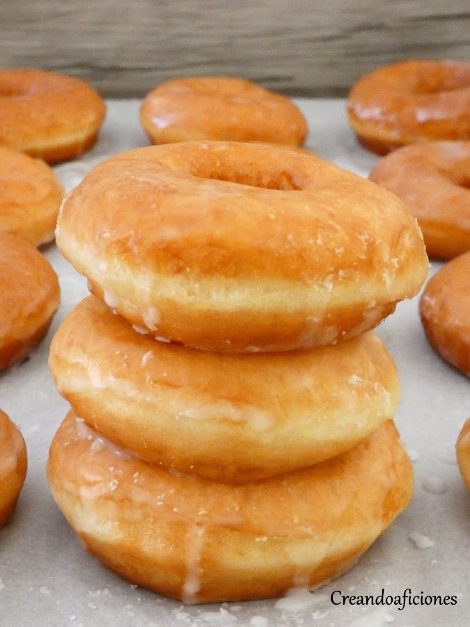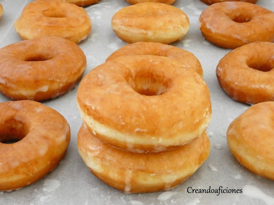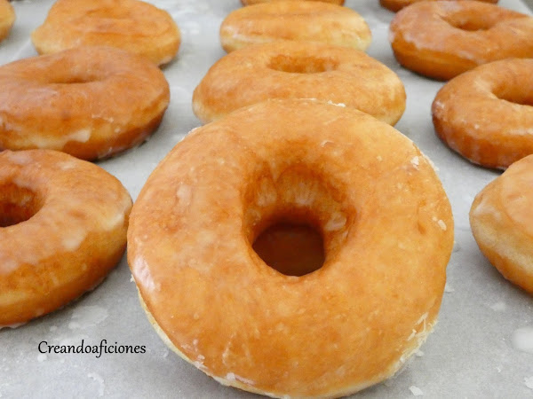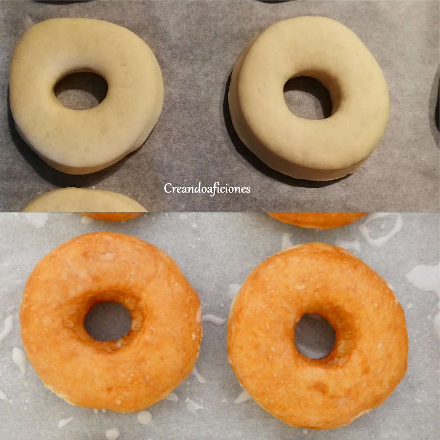 Bañamos los donuts metiendolos hasta mitad y los dejamos secar en una rejilla o papel vegetal.