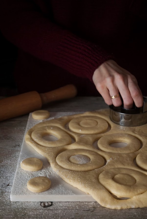 Coloca los donuts sobre la bandeja del horno forrada con papel de hornear y déjalos fermentar tapados con un paño durante unos 40 minutos.