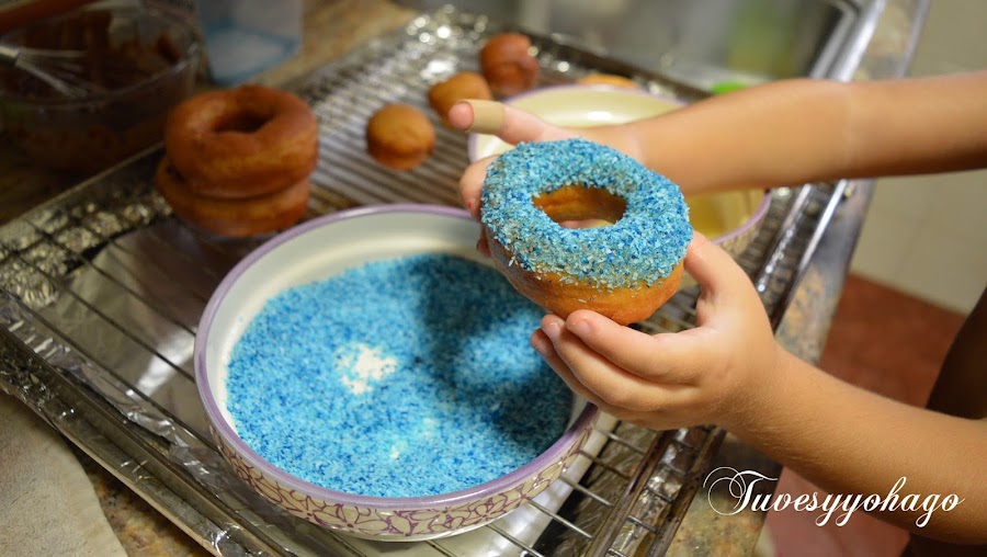 2. Bañar los donuts en un poco de glaseado transparente y a continuación en el coco teñido de azúl.