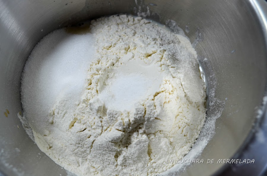Ponemos el resto de harina en un recipiente junto con la sal y el azúcar y mezclamos bien.