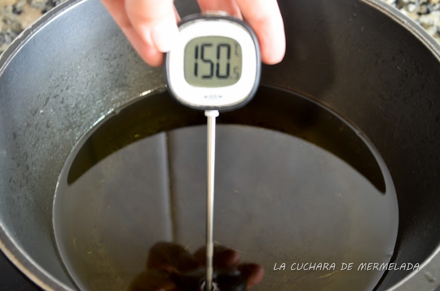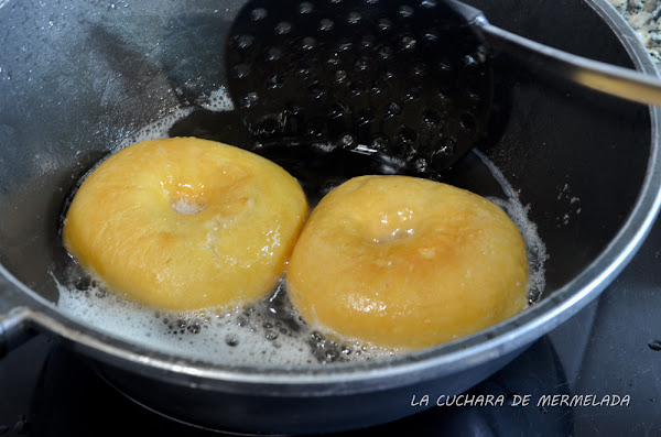 Ponemos a calentar el aceite en una sartén o cazuela honda, entre 150ºC y 170ºC, (temperatura baja/media) con suficiente aceite para que floten, los donuts no pueden tocar el fondo pues se quemarán y quedarán marcados.