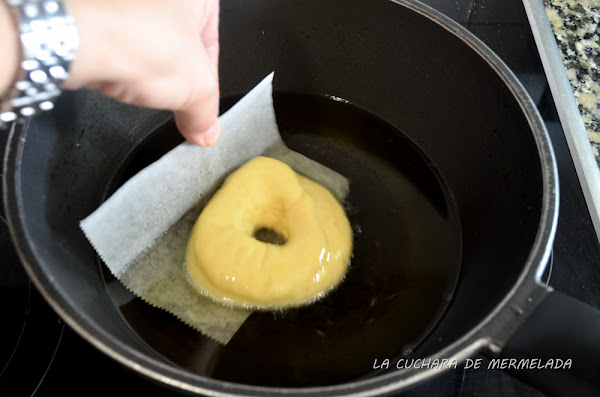 Cogemos cada donuts con su papel y con mucho cuidado los metemos con el papel en el aceite, enseguida se desprenden, sacamos de inmediato el papel.`