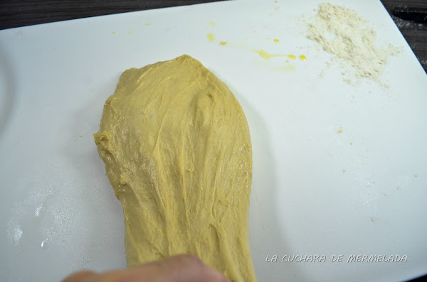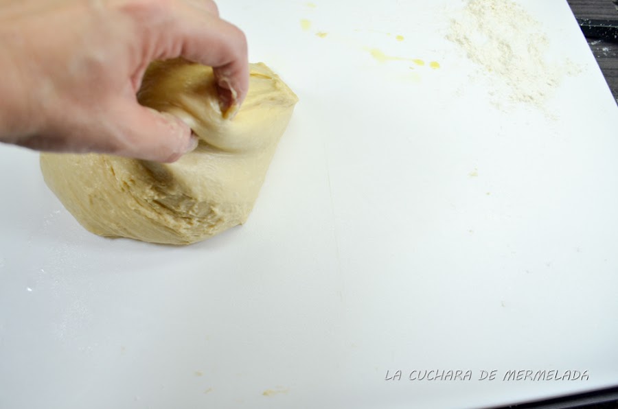 Ahora ponemos la masa en la mesa con un poco de harina o aceite para que no se pegue. Seguimos amasando.