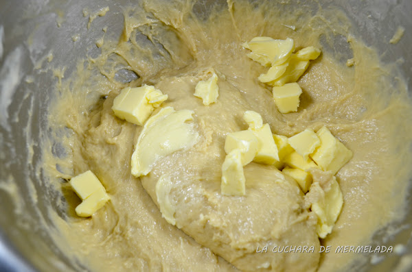 Ya para finalizar incorporamos la mantequilla a temperatura ambiente y amasamos.