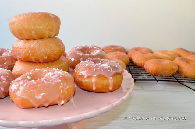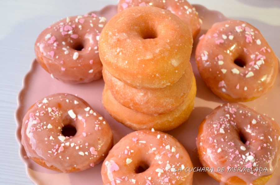 Yo los he glaseado como los originales que son los que más éxito tienen en casa y he puesto unos pocos con cobertura de chocolate blanco que he fundido al baño maría y añadido colorante para que quedaran rositas. Para decorarlos, tenía unos corazoncitos de azúcar, los he troceado y espolvoreado por encima.