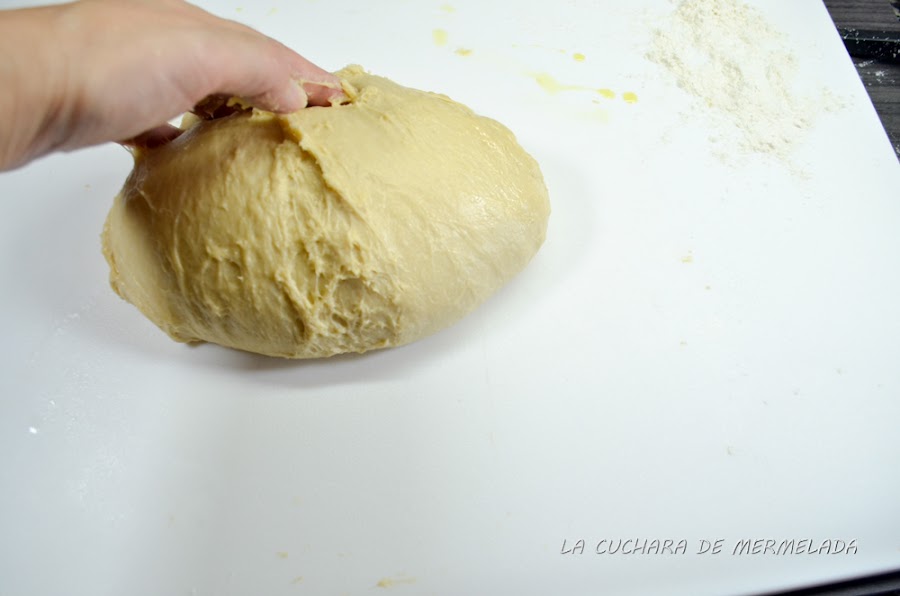Ponemos la masa en la mesa con un poco de harina o aceite en la superficie y también nos untamos las manos con un poco de aceite para que no se pegue y amasamos solo un poco para desgasificarla.