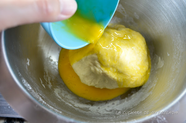 Una vez conseguido la bola bien lisita añadimos el huevo y la yema mezclados, seguimos amasando un poco y a continuación incorporamos el prefermento, que tendrá que haber duplicado su tamaño.