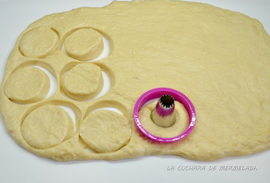Cogemos un cortador de pastas de unos 7 u 9 cm de diámetro y una boquilla de manga pastelera, (hay cortadores de donuts pero sin no lo tenéis usar lo que se os ocurra, como un vaso y un tapón de botella de agua) y hacemos los cortes. Repetimos estos pasos hasta acabar con la masa.