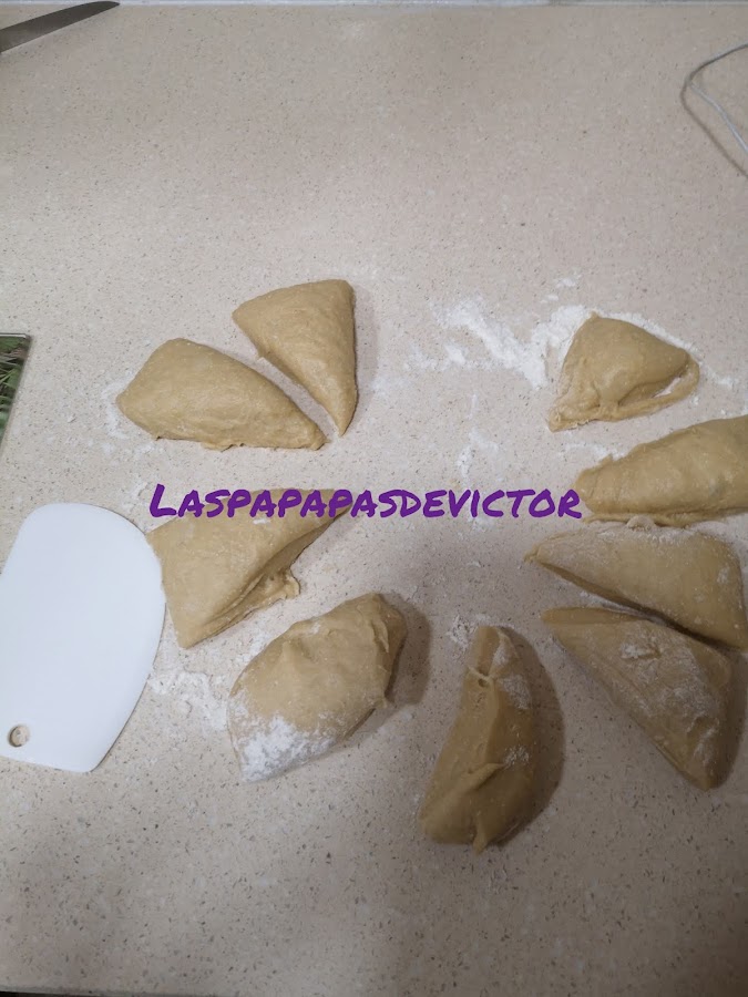 Haremos una bola, la aplastaremos un poco y la cortaríamos en 9 o 10 porciones de 80 grs, haríamos una bolita en cada uno y lo dejaríamos reposar otra hora tapado