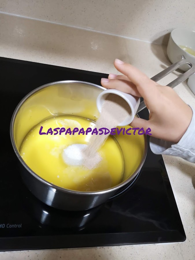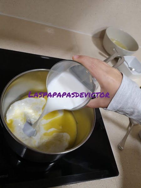 En un cazo haremos el prefemento, pondremos la leche a calentar con la mantequilla, con el agua