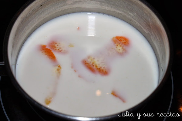 Ponemos a infusionar la leche con la piel de naranja al fuego hasta que empiece a hervir. La retiramos del fuego y la dejamos templar. La colamos.