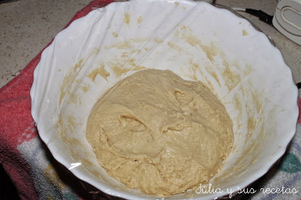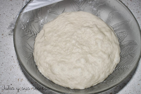 La ponemos en un bol untado con aceite, la tapamos con film transparente y un paño de cocina y la dejamos reposar hasta que doble su volumen.