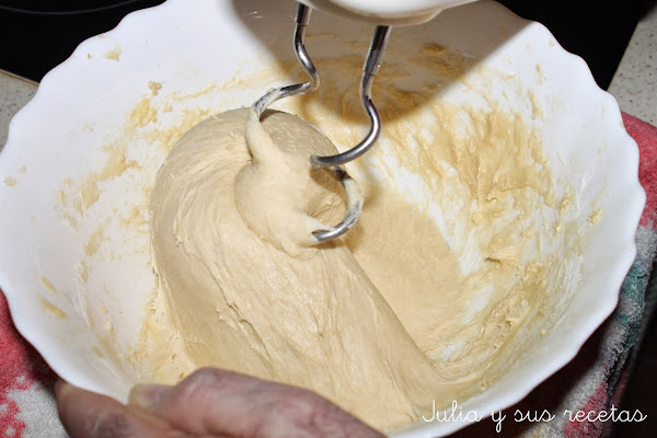 Yo metí las varillas amasadoras, es una masa muy pegajosa y se trabaja mejor con varillas. Debemos amasar hasta que veamos que se va despegando de las paredes.