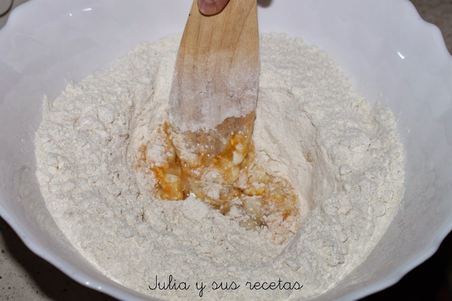 Mientras se templa en un bol grande ponemos la harina, la pizca de sal, el azúcar y espolvoreamos la levadura seca por encima (si es fresca debemos disolver la levadura dentro de la leche templada). Añadimos el huevo y mezclamos un poco.