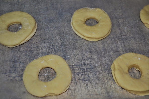 Enharinamos la encimera y extendemos la masa con un rodillo, dejándola como de 1 cm. de altura, cortamos los donuts con un cortapastas y los vamos poniendo en una bandeja tapados con un paño en lugar cálido durante 40 minutos.