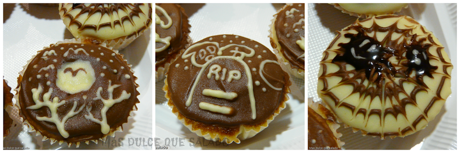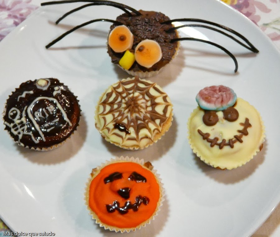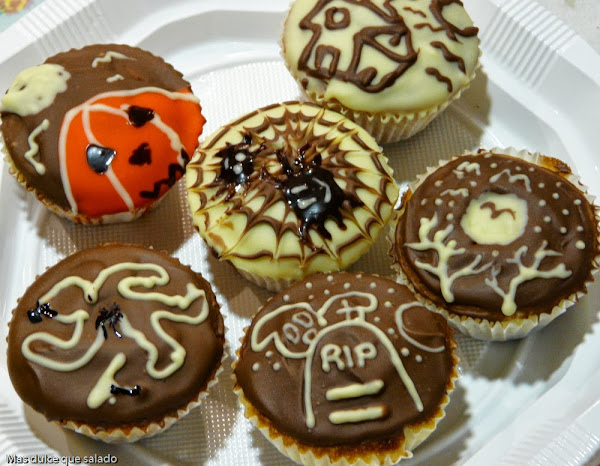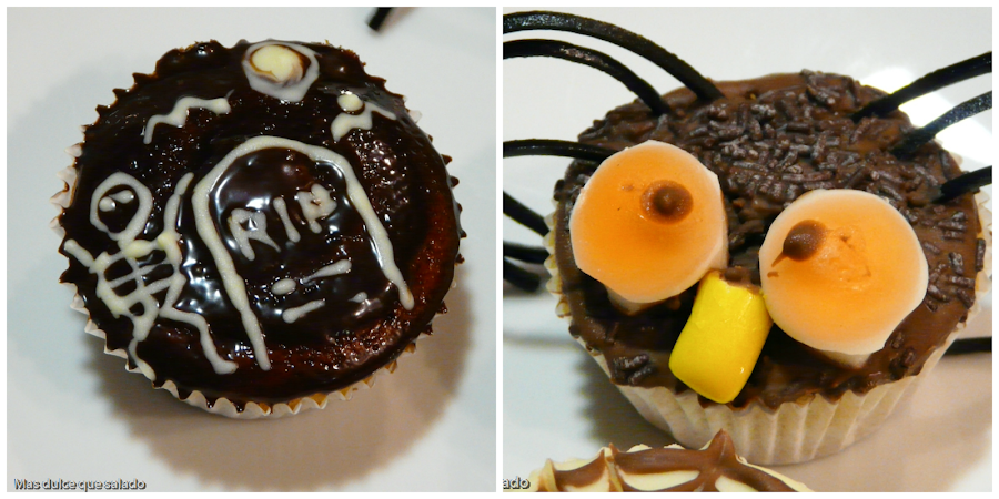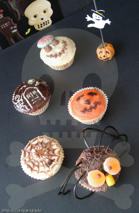 Estos son los cupcakes de Marta: una araña, una tela de araña con su araña hecha con sirope de chocolate, una niña con cicatrices y una bruja montada en su escoba. Los otros se los zampo antes de que le hiciéramos la foto.