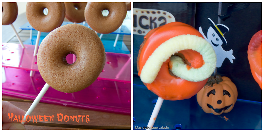 Una vez fríos Carmen los pincho con un palito de cake pops y los baño en chocolate blanco teñido con colorante naranja. Dejo que secaran y luego lo adornó con un gusano de gominola. Otros los adorno con arañas y telas de araña de chocolate que habíamos hecho el día anterior usando un molde de bombones.