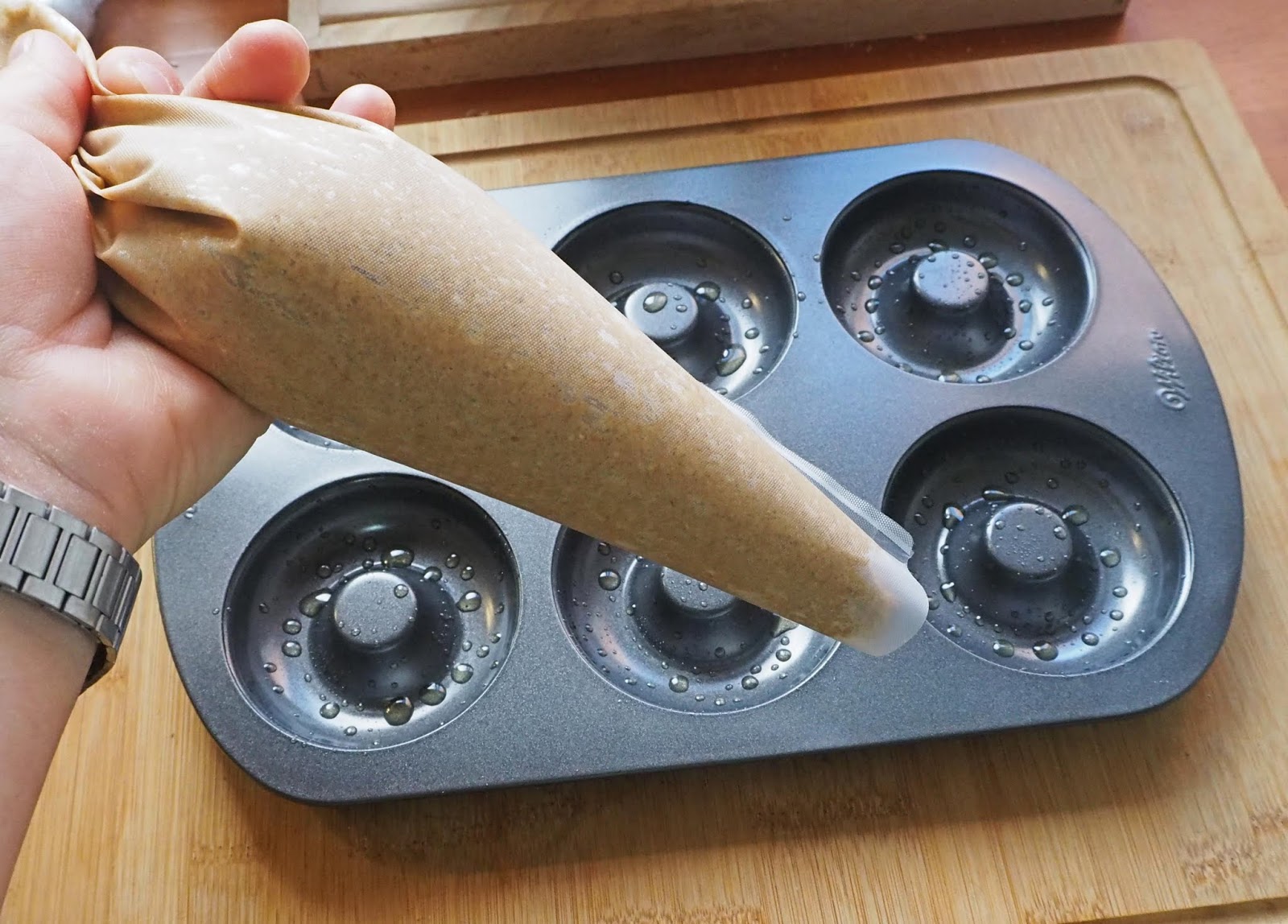 - Engrasamos los moldes para donuts y con una manga pastelera, rellenamos los huecos.