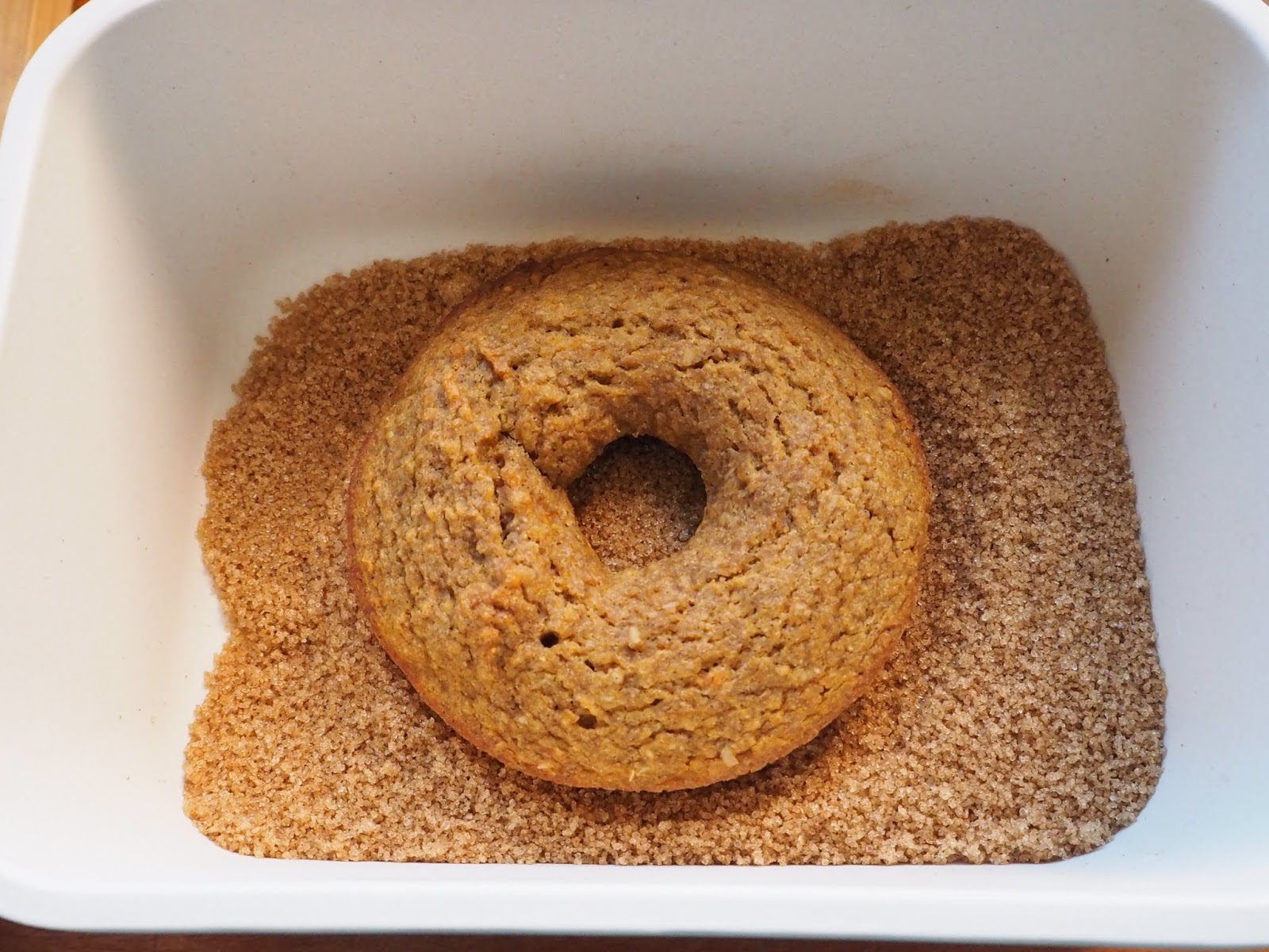 - Por otro lado, preparé una mezcla de azúcar moreno (bueno, edulcorante equivalente) y canela. Rebocé el resto de donuts en la mezcla, apretando un poco para que se pegara bien.